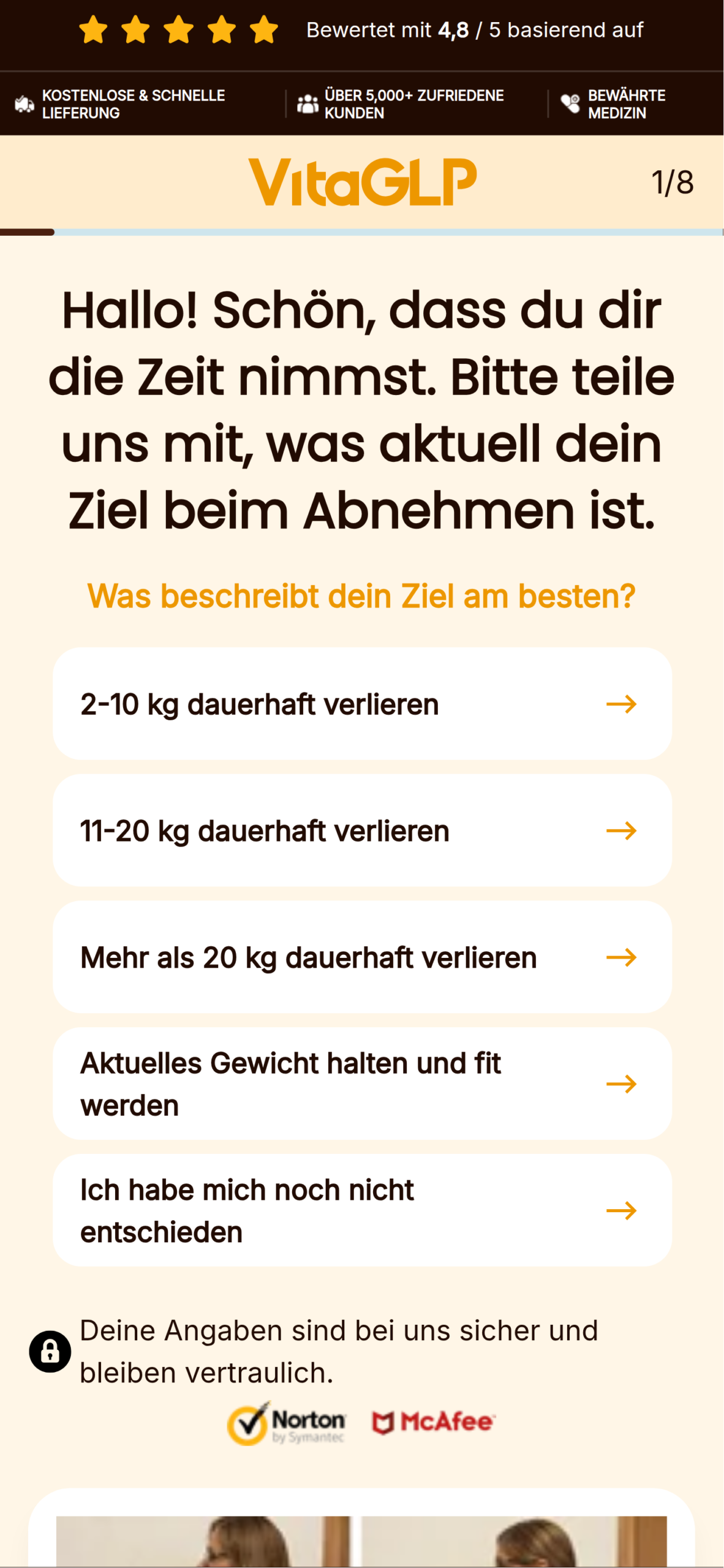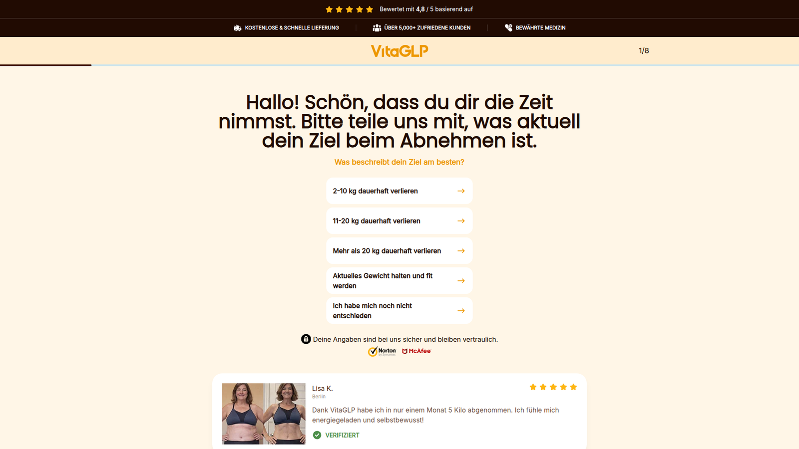 VitaGLP ist ein natürliches Nahrungsergänzungsmittel, das speziell für Menschen entwickelt wurde, die ihren Stoffwechsel auf gesunde Weise ankurbeln möchten. Im Gegensatz zu kurzfristigen Diäten oder aggressiven Stimulanzien arbeitet VitaGLP mit deinem Körper zusammen: Die Formel aus natürlichen Inhaltsstoffen — darunter Koreanischer Ginseng, Grüntee-Extrakt, Ingwer und Berberin — unterstützt Fettverbrennung, Verdauung, Energie und hormonelles Gleichgewicht. Hergestellt in EU-zertifizierten Einrichtungen nach FDA-Standards, vertrauen bereits über 5.000 Kunden auf VitaGLP.